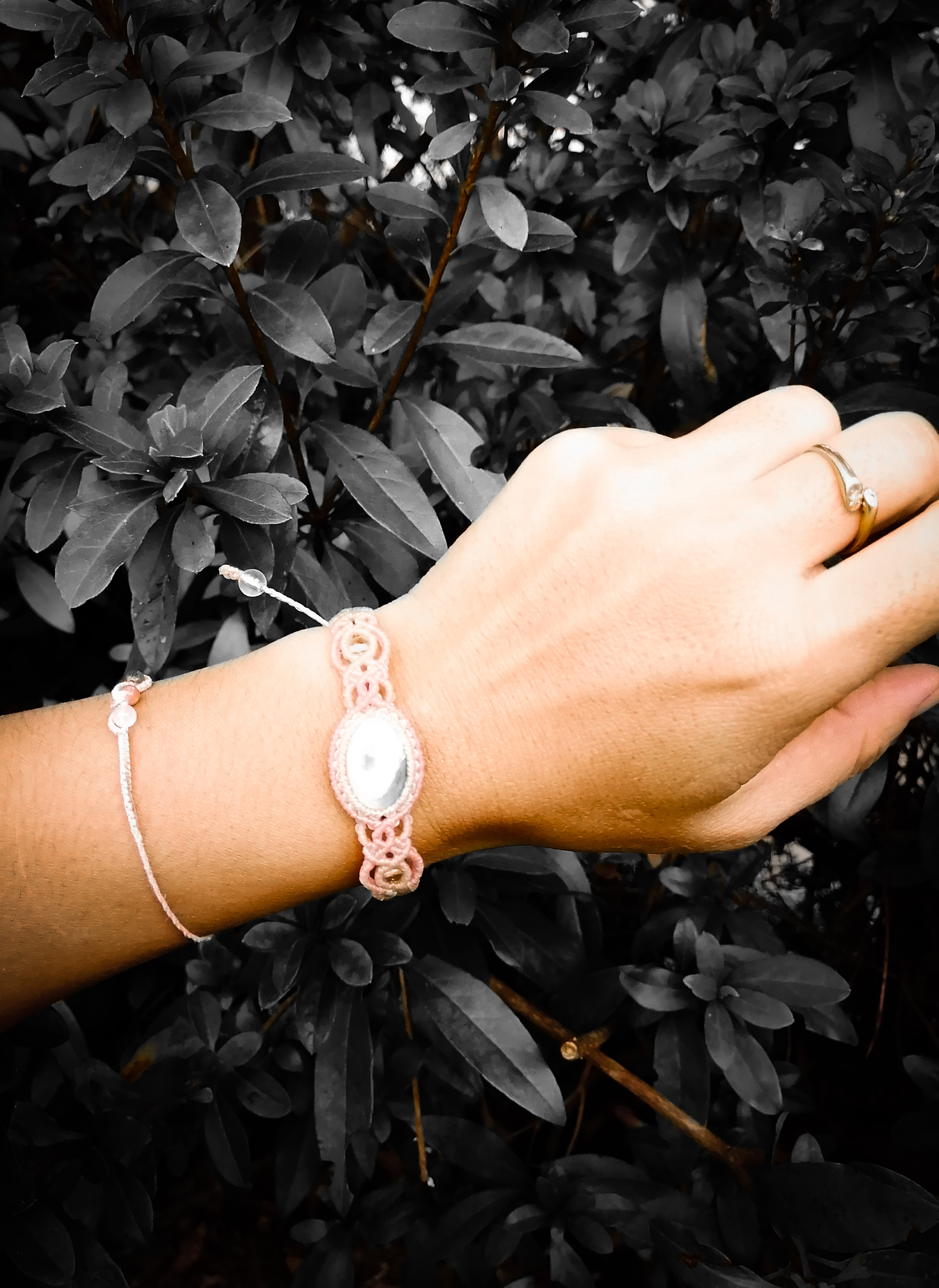 優しいピンクとベージュのマクラメコードに包まれて、柔らかな可愛らしさを感じるブレスレットになりました。