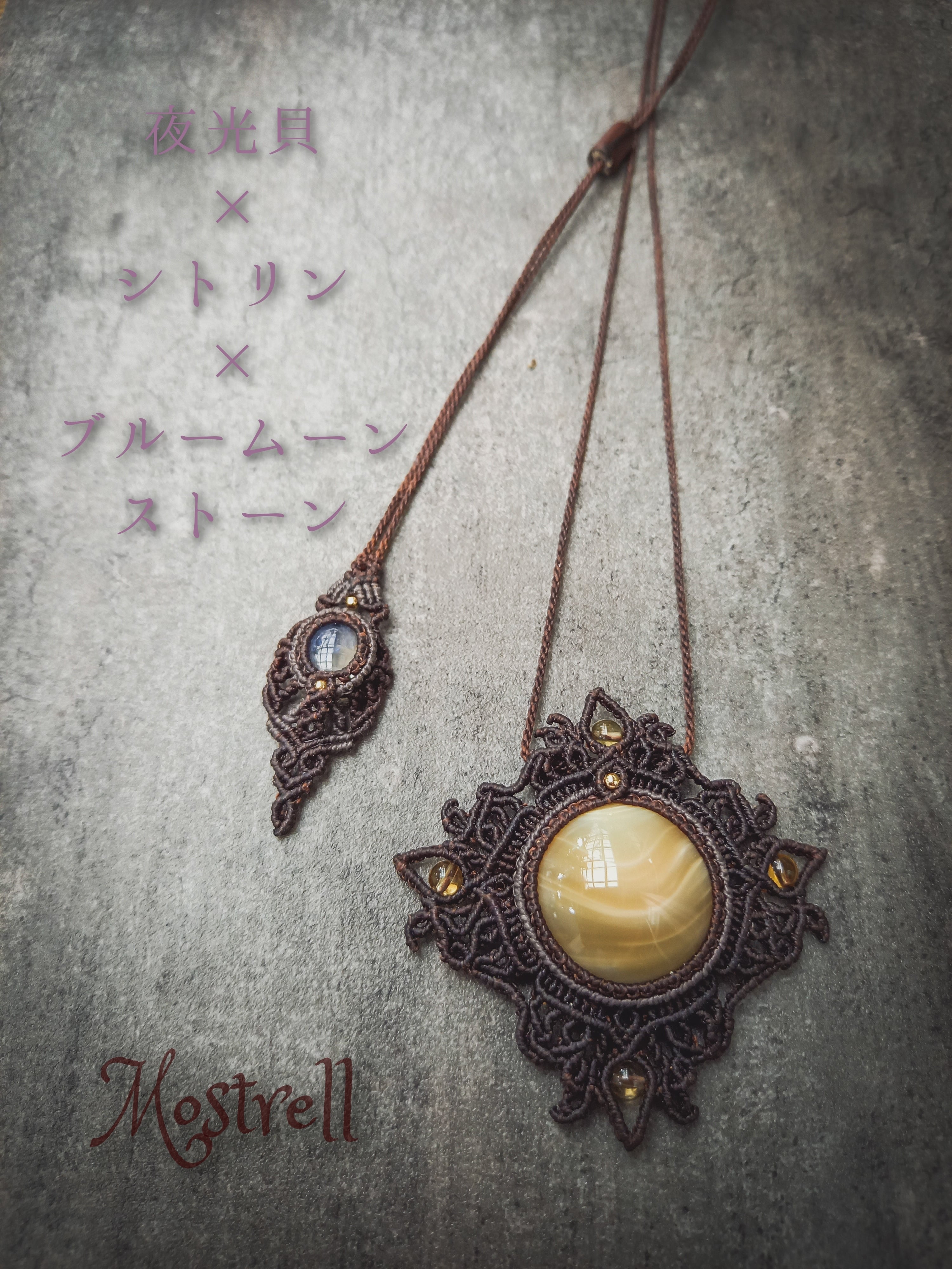繊細なマクラメ装飾に14kgfビーズとシトリンを、背守りには透明度の高いホワイトラブラドライトを合わせています。